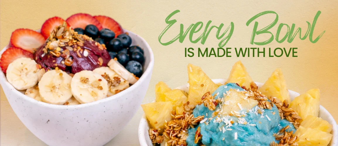 Our bowls combine nutrient-dense bases like açai and pitaya with fresh toppings including granola, fruit, and nut butters. Each bowl delivers antioxidants, fiber, and natural energy, giving you a refreshing and wholesome meal with a satisfying crunch and vibrant flavor.